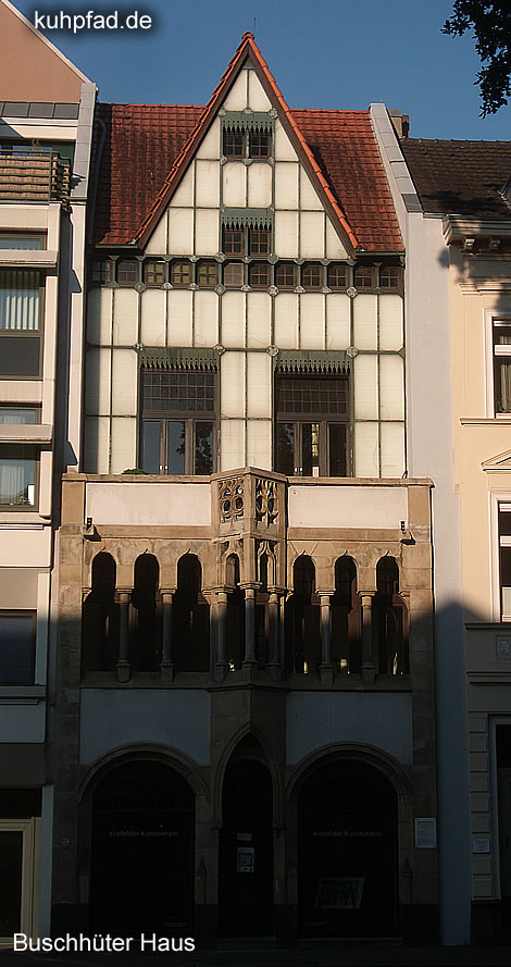 Das so genannte Buschhüterhaus zählt zu den besonderen und sehenswerten Bauwerken in der Stadt Krefeld. Die wunderschöne Fassage des Hauses besticht durch ihre Säulen und Fensterbögen. Auffällig ist auch der spitze Giebel des Hause Der Architekt Karl Buschhüter lebte von 1872 bis 1956 in Krefeld und erbaute unter anderen das Buschhüter Haus, das seit 1973 am Westwall in Krefeld steh . Errichtet wurde das Buschhüterhaus jedoch an der St. Antonstr. 91, von wo aus es 1970 weichen musste und seither am Westwall steht. Heute befindet sich in dem historischen Gebäude Buschhüterhaus der Krefelder Kunstverein