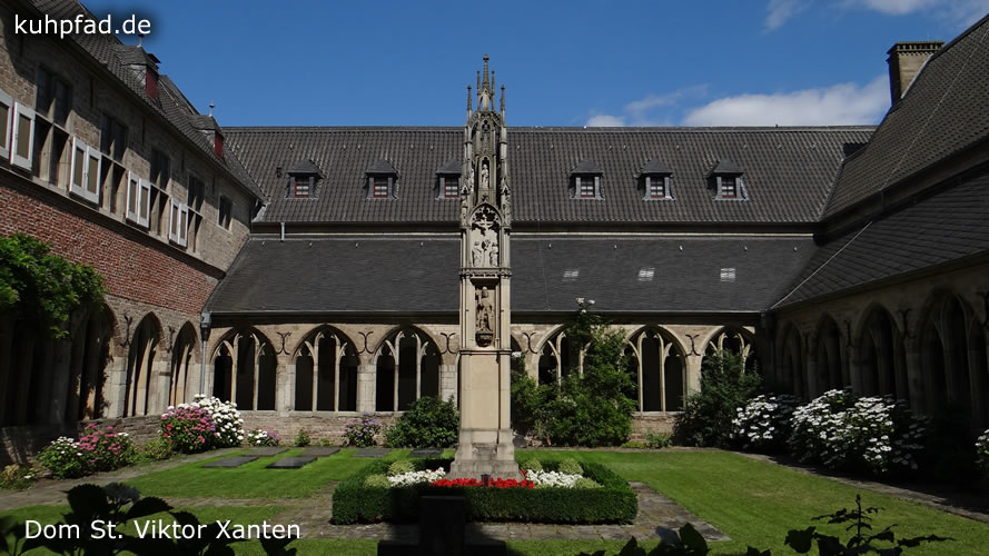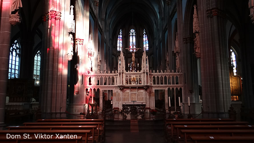 - Sehenswertes: Die Krypta des Doms mit den Gebeinen des Heiligen Viktors, der mit einigen Gefährten im 3. Jahrhundert den Märtyrertod starb, ist so zu sagen die Keimzelle des Doms. Errichtete erstmals die heilige Helena eine Kapelle auf dem Grab, entstand im 8. Jahrhundert an derselben Stelle eine Stiftskirche „Ad Sanctos“, was zu den Heiligen bedeutet, und woraus sich später der Stadtnamen Xanten entwickelt. Heute lockt der Dom Pilger und Gläubige aus der ganzen Welt. Des Weiteren sind Marienaltar, Gewölbemalerei, Hochaltar und Kunstwerke sehr sehenswert.