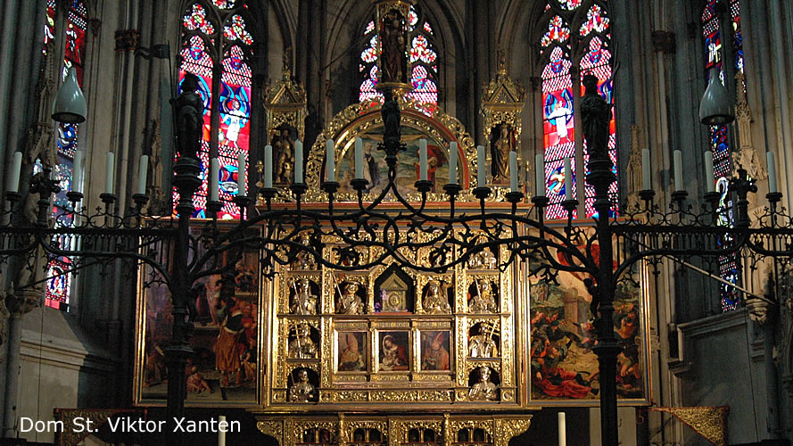 Der Dom St. Viktor Xanten gehört zu den bedeutesten mitteralterlichen Bauwerken am Niederrhein und ist eine der zahlreichen Sehenswürdigkeiten der alten Römerstadt. Kirche und Kreuzgang des Doms Sankt Viktor sind täglich geöffnet, so kann der Besucher einen Blick auf die erstaunliche Architektur der heutigen Pfarrkirche werfen. Generationen hatten an dem Dom gebaut, bevor er dann im 16 Jahrhundert nahezu fertiggestellt war, und im 2. Weltkrieg stark beschädigt wurde. Heute erscheint der Dom im neuen Glanz, und beeindruckt seine Besucher mit einer Vielzahl an Kunstwerken und architektonischen Meisterleistungen. So zum Beispiel der Marienaltar und Gewölbemalereien in der ehemaligen Sakristei, und nichts zu vergessen der Hochaltar aus den Jahren 1529-1549.