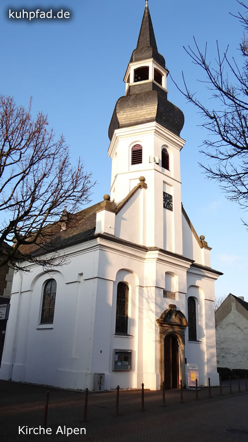 Evangelische Kirche Alpen gehört zu den ältesten reformierten Kirchen Deutschlands, deren Grundstein um 1600 von der Kurfürstin Amalia von der Pfalz gelegt wurde. Die KIrche besitzt eine bewegte Geschichte. Sie wurde zerstört und wieder aufgebaut. Heute erstrahlt der denkmalgeschützte Kirchenbau aus weißverputzten wieder.
