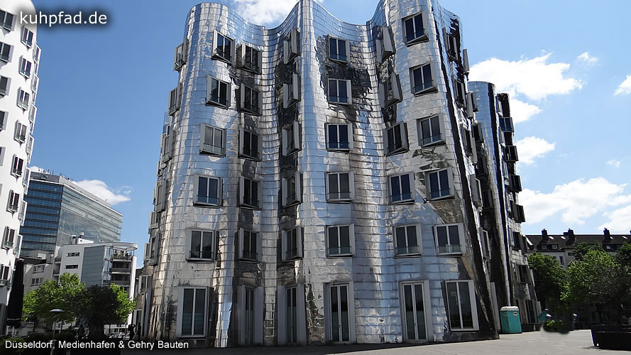 Die mittlerweile berühmten Gehry Bauten im Düsseldorfer Medienhafen gehören zu den meist fotografierten Motiven in Düsseldorf. Die Bauwerke sind nach ihrem Architekten Frank Gehry benannt, die von 1996 bis 1999 im Düsseldorfer Medienhafen errichtet wurden und 1999 feierlich eingeweiht wurden. Die 3 Gebäudekomplexe wirken aufgrund der verschiedenen Fassaden sehr kontrastreich, wobei sich beide äußeren Bauwerke in der Fassade des mittleren Gebäudes spiegeln.