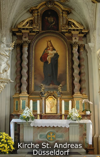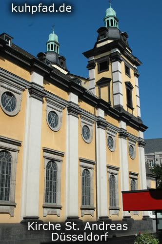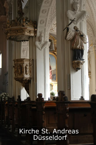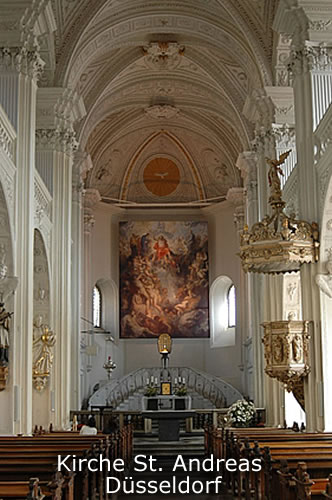 Kirche St. Andreas Düsseldorf, die ehemalige und sehenswerte Jesuitenkirche St. Andreas steht in der Düsseldorfer Altstadt und befindet sich heute im Besitz des Landes NRW. Nach Zerstörungen im 2. Weltkrieg zeigt sich die Andreas-Kirche heute im neuen Glanz, den Besucher während der Öffnungszeiten oder während einer Führung (Termine siehe Webseite) bestaunen können. Der wunderschöne Sakralbau mit seinen prächtigen Stuckdekorationen und dem Einfluss italienischer Architektur gehört zu den schönsten seiner Art, und ist daher besonders sehenswert. Heute übernehmen Dominikaner die seelsorgerischen Aufgaben in der ehemaligen Jesuiten-Kirche.
