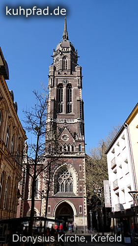Kirche St. Dionysius Krefeld steht nahezu im Zentrum der 4 Wälle, Westwall, Südwall, Ostwall und Nordwall, die den Stadtkern Krefelds begrenzen. Gebaut in mehreren Epochen erstrahlt das Gotteshaus heute als 3-schiffige Hallenkirche, wobei der Westturm über den ganzen City-Bereich hinausragt.
