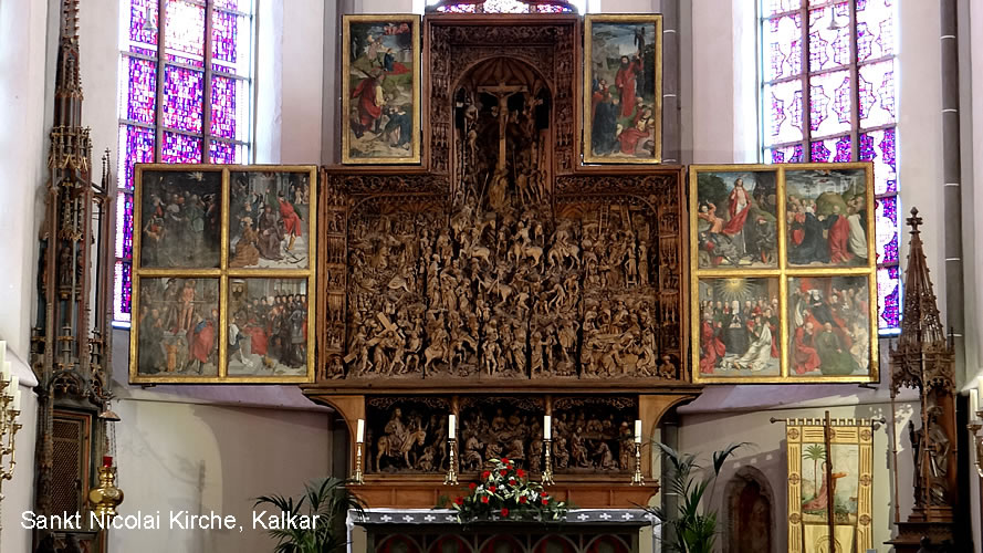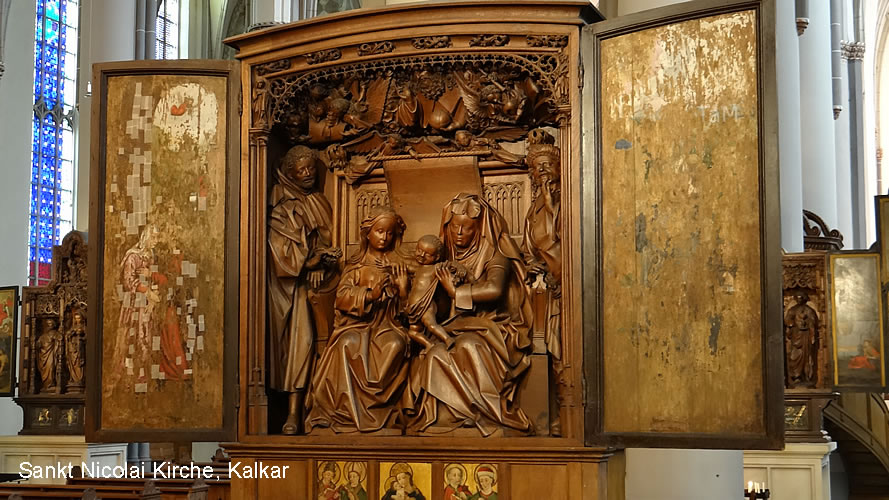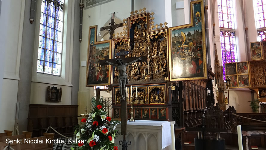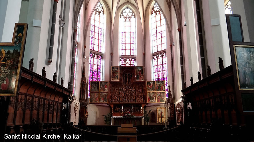 Die gotische Kirche St. Nicolai in Kalkar am Niederrhein wurde im frühen 15. Jahrhundert erbaut und gehört zu den Sehenswürdigkeiten (Must See), die du gesehen haben solltest. Die St. Nicolai Kirche ist unter anderem für seine Schnitzkunstwerke bekannt, die zum Beispiel den Hochaltar schmücken. Heute beeindrucken noch 8 der ehemaligen 15 Altäre im Inneren der Kirche durch ihre fantastischen Holzschnitzereien. Aber auch Gemälde und Statuen schmücken die Kirche, so dass Besucher die verschiedensten Kunstkostbarkeiten zu sehen bekommen. Der Marienalter stammt von Meister Loedewig und der St. Georgsaltar von Meister Arnt von Zwolle, der etwa 1480 entstanden ist. Zudem beeindrucken die Wand- und Gewölbemalereien, so dass eine Besichtigung der Kirche sicher lohnenswert ist.