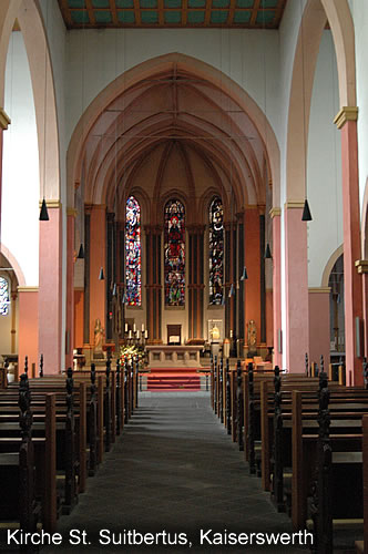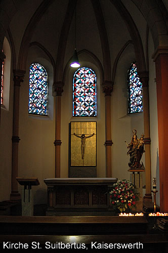 - Sehenswertes: Schrein mit den Gebeinen des heiligen Suitbertus, Marien Statue, Kirchenfenster, Stiftsplatz
