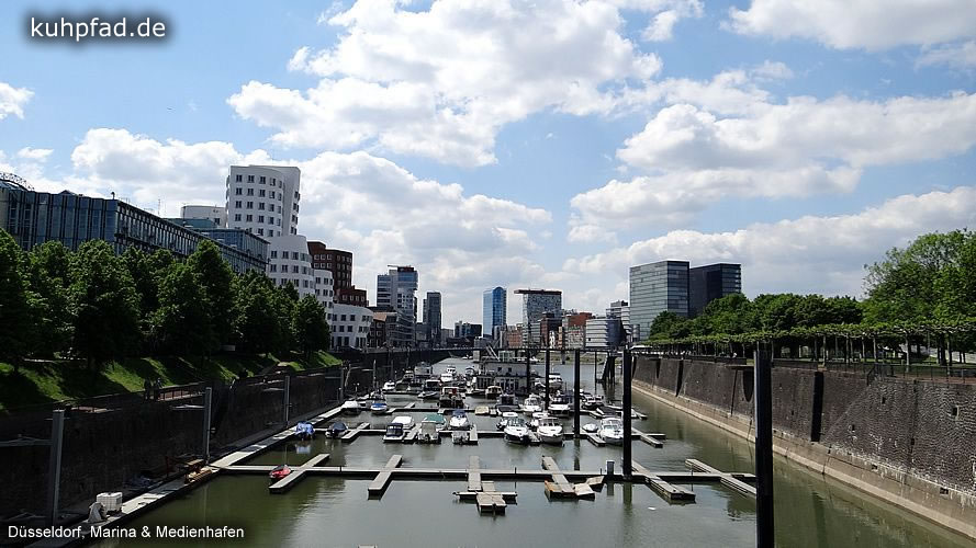 Zum Medienhafen gehört auch die Düsseldorfer Marina, die in einem separaten Hafenbecken zu Füßen des Fernsehturms liegt und Liegeplätze für die verschiedensten Boote bietet.