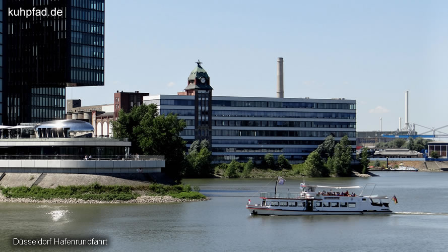 Entdecke den Medienhafen vom Rhein aus während einer eine Hafenrundfahrt, bei der du bereits einen Eindruck vom Medienhafen erhälst.
