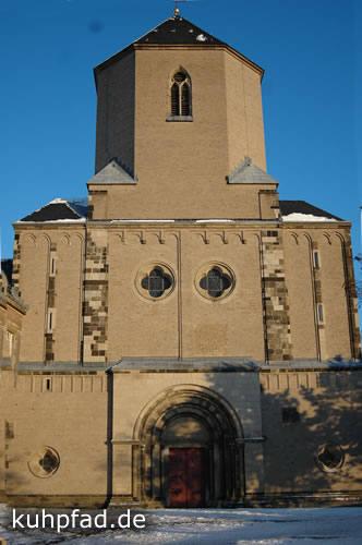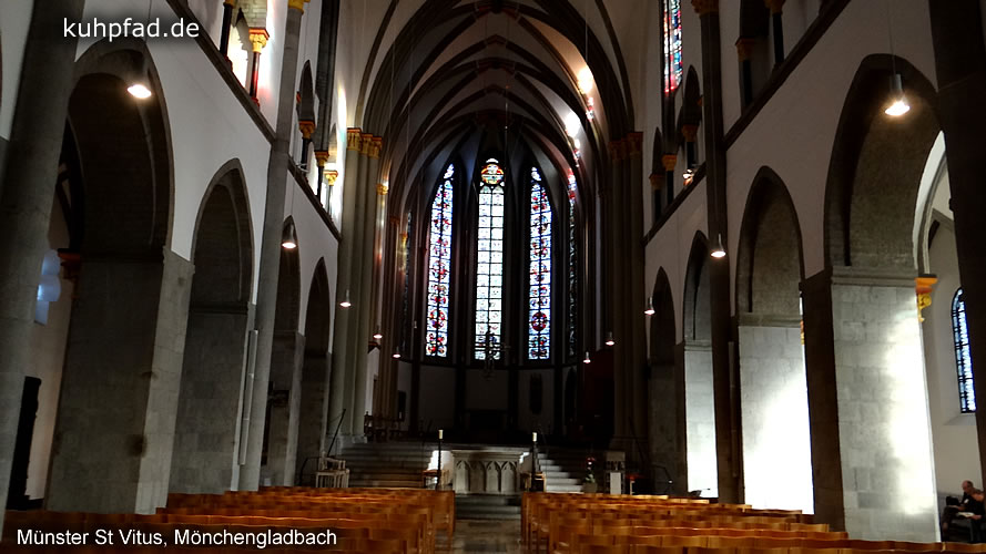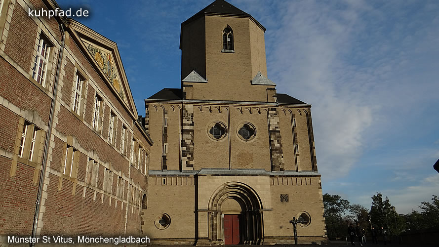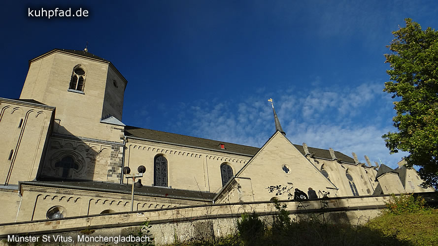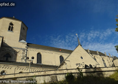 Münster St. Vitus, die romanische Basilika mit gotischer Chorhalle befindet sich auf dem Abteiberg der Stadt Mönchengladbach. Die Bibelfenster der sehenswerten Basilika Münster St. Vitus stammen aus dem 13. Jahrhundert und gehören zu den bedeutensten in Deutschland. In der Schatzkammer des Münsters findet man zudem Goldschmiedearbeiten sowohl aus dem 19. Jahrhundert als auch aus der Barockzeit sowie sakrale Kunst. Die Münsterkirche St. Vitus gehörte in der Vergangenheit zur Benediktinerabtei und wurde 1974 zur Basilika Minor ernannt. Heute wird das sehenswerte Bauwerk als Pfarrkirche der Pfarre Sankt Vitus genutzt. Andere ehemailge Gebäude der Abtei sind heute Verwaltungssitz der Stadt Mönchengladbach.