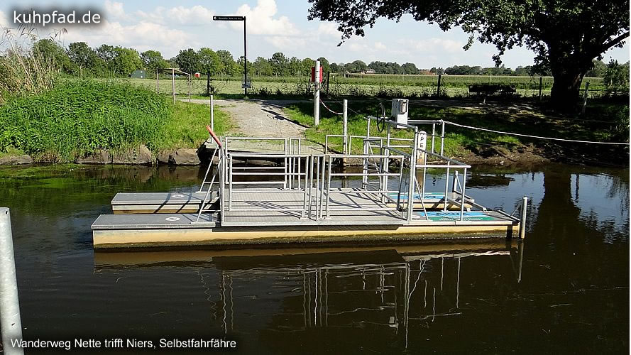 Ein weiteres Highlight in der Umgebung liegt auf dem Weg zum Mündungsbereich. Hier führt dich über die Niers eine kleine Selbstbedienungsfähre , die sehr einfach zu bedienen ist. An den Koordinaten 51.413505, 6.325429 musst du nur auf die Fähre steigen und das Kurbelrad drehen, und schon setzt sich die Fähre in Bewegung. Sollte sich die Fähre einmal auf der anderen Uferseite befinden, kannst du diese ebenfalls mit einem Kurbelrad, welches an den beiden Uferseiten angebracht ist, auf deine Seite holen. Die Selbstbedienungsfähre ist einfach zu bedienen. Zudem kann man auf der Fähre auch Fahrräder transportieren.