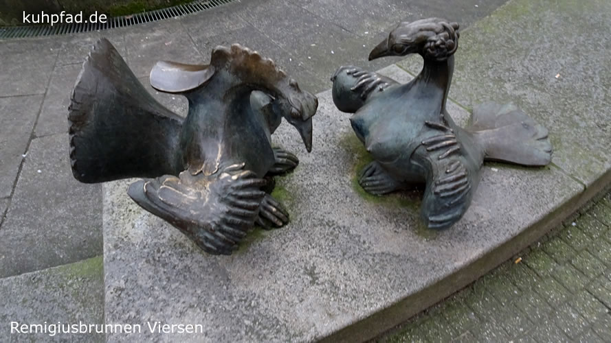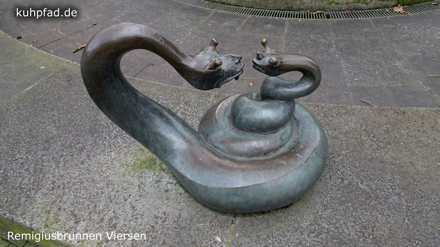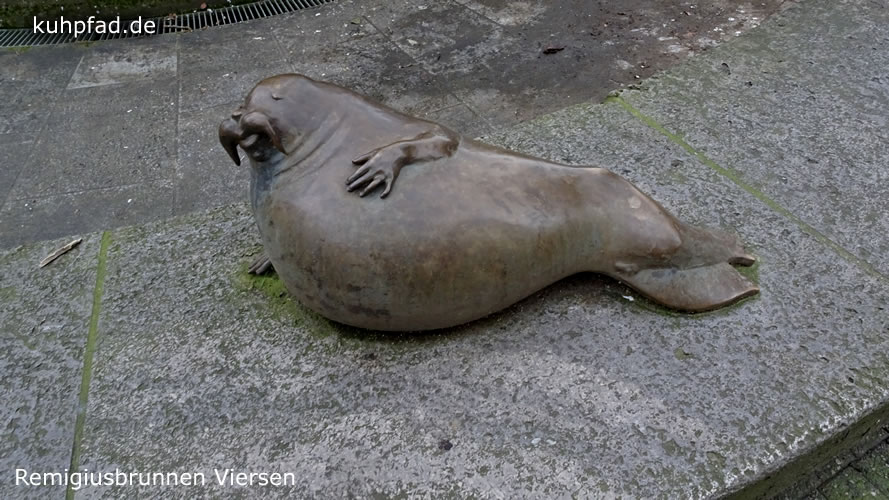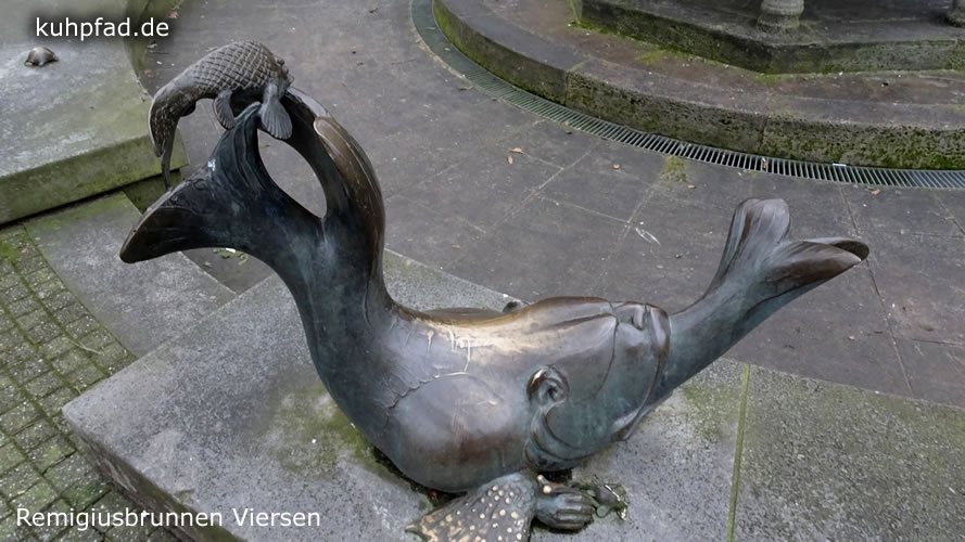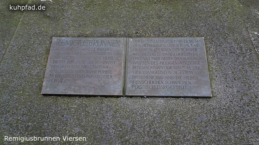 Remigiusbrunnen Viersen steht in Zentrum der Stadt Viersen am nördlichen Ende der Hauptstraße, die hier Fußgängerzone ist. Umgestaltet wurde der sehenswerte Brunnen vom Bildhauer Gernot Rumpf, der eine Figur des heiligen Remigius in die Mitte des Brunnen platzierte. Der Heilige wurde bereits im Mittelalter als Schutzpatron der Stadt verehrt, was sich an vielen Orten der Stadt zeigt. So auch an diesem Brunnen, der 1981 umgestaltet wurde und bis heute ein bedeutendes Kunstwerk ist. Die dargestellten Tiere am Rand des Brunnen symbolisieren die Schwäche der Menschen. Der Stier steht für Zorn, Vögel stehen für Wollust, Schlange soll den Neid charakterisieren und der Seehund die Trägheit. Eitelkeit ist durch den Pfau dargestellt und Gier durch den Fisch sowie Geiz durch die Glucke. Der Künstler setzt das Thema der christlichen Moral (die sieben Todsünden ) in seinem Kunstwerk und auf seine Art und Weise um.