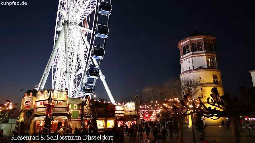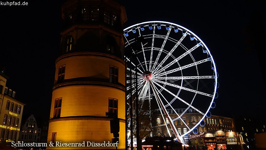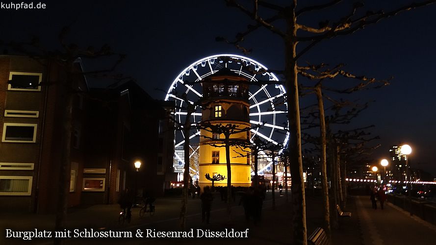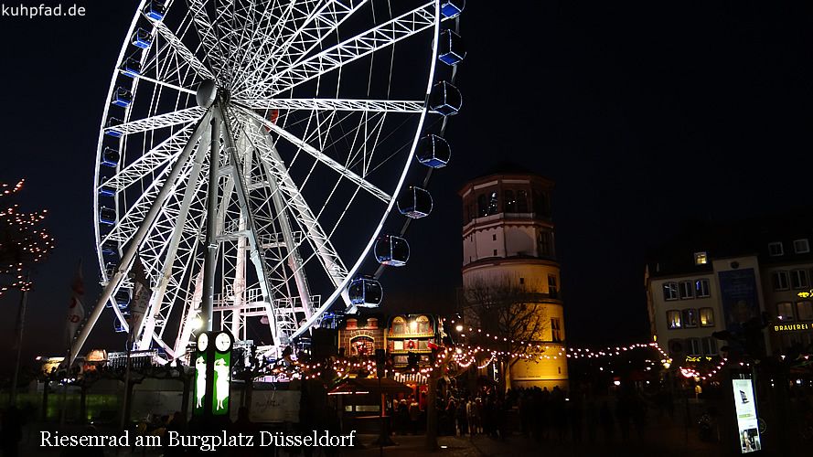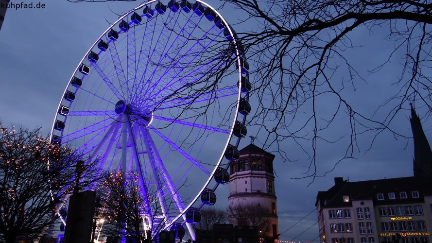 Riesenrad Düsseldorf, auf dem Burgplatz in der Düsseldorfer Altstadt steht von etwa Mitte Oktober bis Anfang Januar das beliebte Riesenrad. Das Wheel of Vision, wie das Riesenrad bezeichnet wird, bietet einen schönen Blick auf den Rhein und die Altstadt. Fahrten sind täglich möglich. An Feiertagen gelten jedoch geänderte Öffnungzeiten. Ein besonderes Highlight sind Exklusivfahrten mit dem Riesenrad, darunter Brunchfahrten oder Fahrt mit Foodbox. Des Weiteren stehen VIP Gondeln zur Verfügung. Für Exklusivfahrten sind jedoch im Vorfeld Reservierungen notwendig. Gruppentickets, Specials oder Exklusivfahrten müssen im Voraus vorbestellt werden.