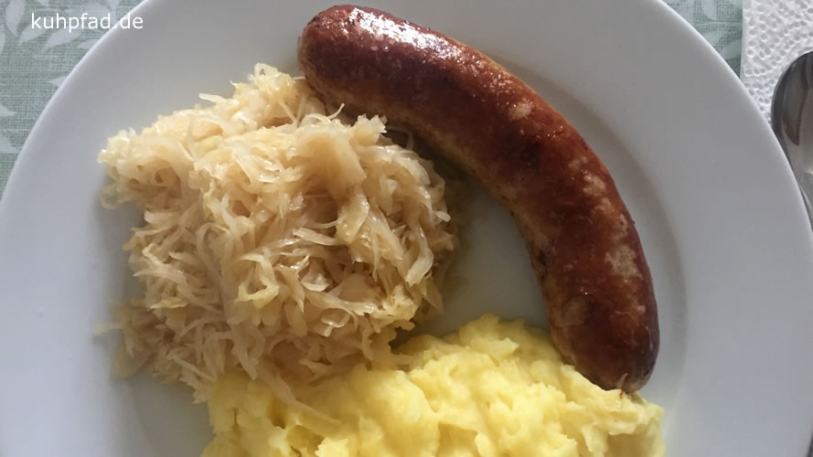 Die Zeit während das Sauerkraut weich wird, kannst du nutzen, um die Kartoffeln zu schälen, die du nach etwa 40 Minuten aufsetzen solltest. Nach 50 Minuten entnehme schließlich das Fleisch sowie die Zwiebel und reibe die geschälte rohe Kartoffel unter das Sauerkraut, so dass es sämiger wird. Es wird dann Zeit die Würstchen mit ein wenig Fett oder Öl in einer Pfanne zu braten. Nach den 60 Minuten sollten dann Sauerkraut und auch die Kartoffeln fertig sein, die du dann abschütten und danach stampfen musst. Füge dem Kartoffelbrei schließlich etwa 100 Milliliter warme Milch hinzu und ein Stück Butter (30-40 Gramm), schmecke ihn mit Salz und Pfeffer ab und rühre ihn mit einem Schneebesen oder Mixer cremig. Rühre aber nicht zulange. Eine cremige Konsitenz ist ausreichend. Während all diesem halte die Bratwürste im Auge und wende sie ab und zu. Wenn das Kartoffelpüree fertig ist, dann sollten auch deine Würste fertig sein und du kannst Alles zusammen auf einem Teller anrichten. Und wenn du auch den Tisch schön gedeckt hast, dann genieße dein hoffentlich perfektes Essen mit Genuss, Zeit und Leuten, die deine Mühe zu schätzen wissen.