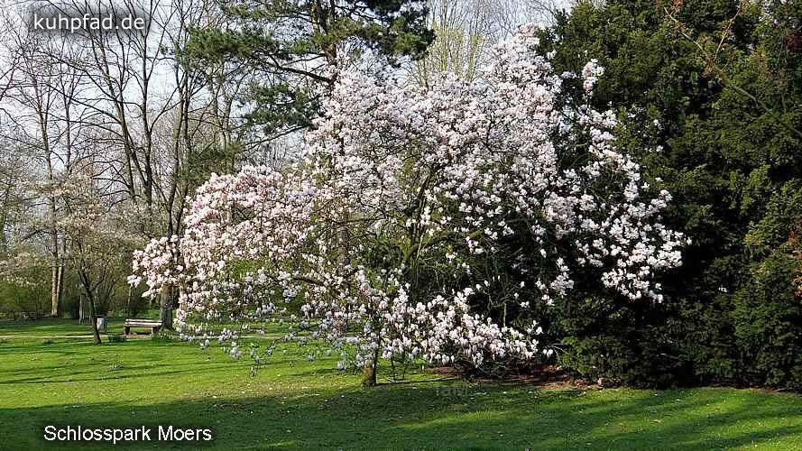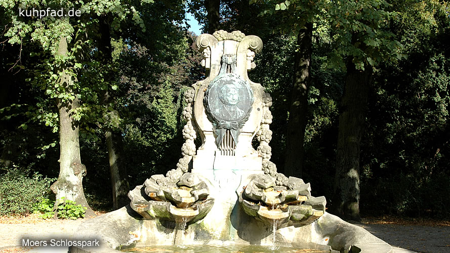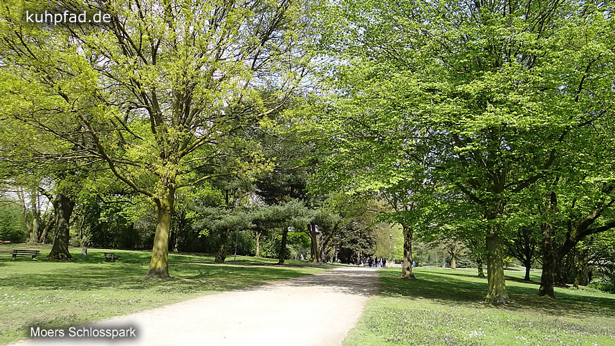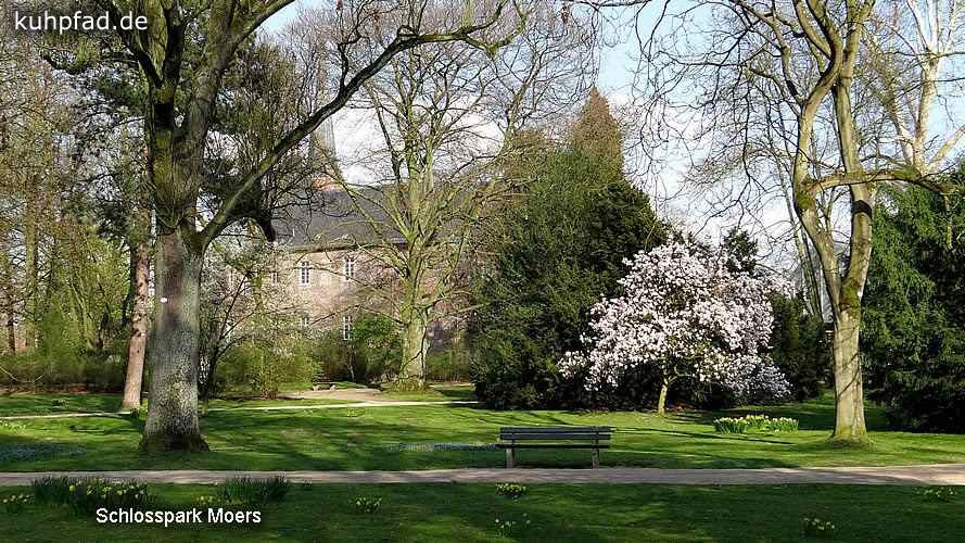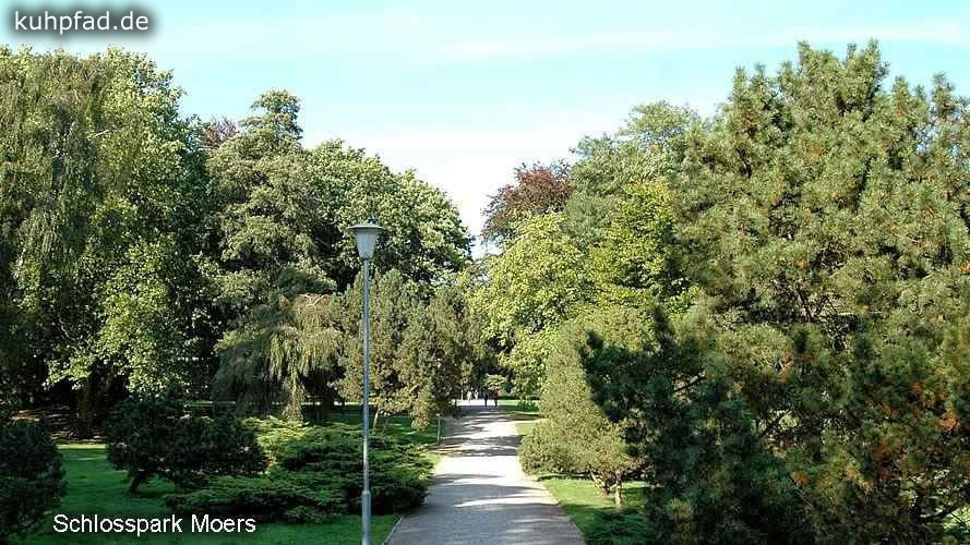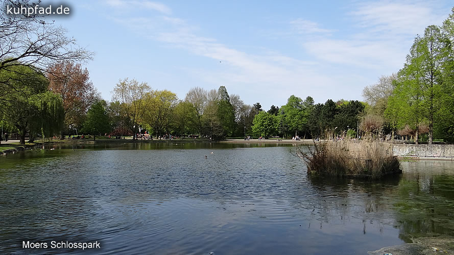 Schlosspark Moers, um 1836 wurde das Areal um Schloss Moers zu einem Park im englischen Styl ausgebaut, und im Laufe der Zeit vergrößert. Heute gehören zum 17 Hektar großen Park ein Freizeitpark, ein Streichel Zoo, und ein Japanischer Garten. Da die Parkanlage nur wenige Schritte von der Altstadt Moers entfernt liegt, und sie Jedermann offensteht, ist es nicht weiter verwunderlich, dass der Park sehr beliebt ist. Insbesondere zum alljährlichen Jazz-Festival strömen Menschen aus nah und fern nach Moers, um im Park das Festival zu erleben. Im Schloss, das am Rande des Schlossparks liegt, befindet sich zudem das Grafschafter Museum und das Schlosstheater.