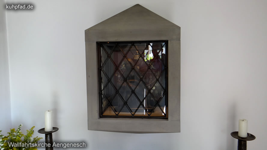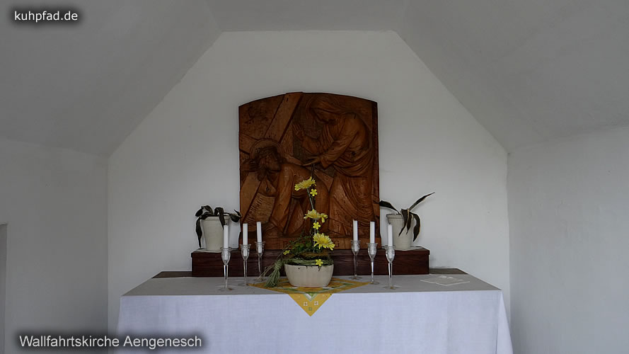 Sehenswertes: Das Gnadenbild der Schmerzensmutter befindet sich in der Seitenkapelle. Sehenswert ist zudem der neugotischen Altar, sowie ein Altargemälde. Des Weiteren ist oberhalb der Kirchenpforte eine steineren Statue der Schmerzensmutter. Die Glocke in Aengenesch erklingt um 12.00 Uhr sowie zum Angelusgebet.
